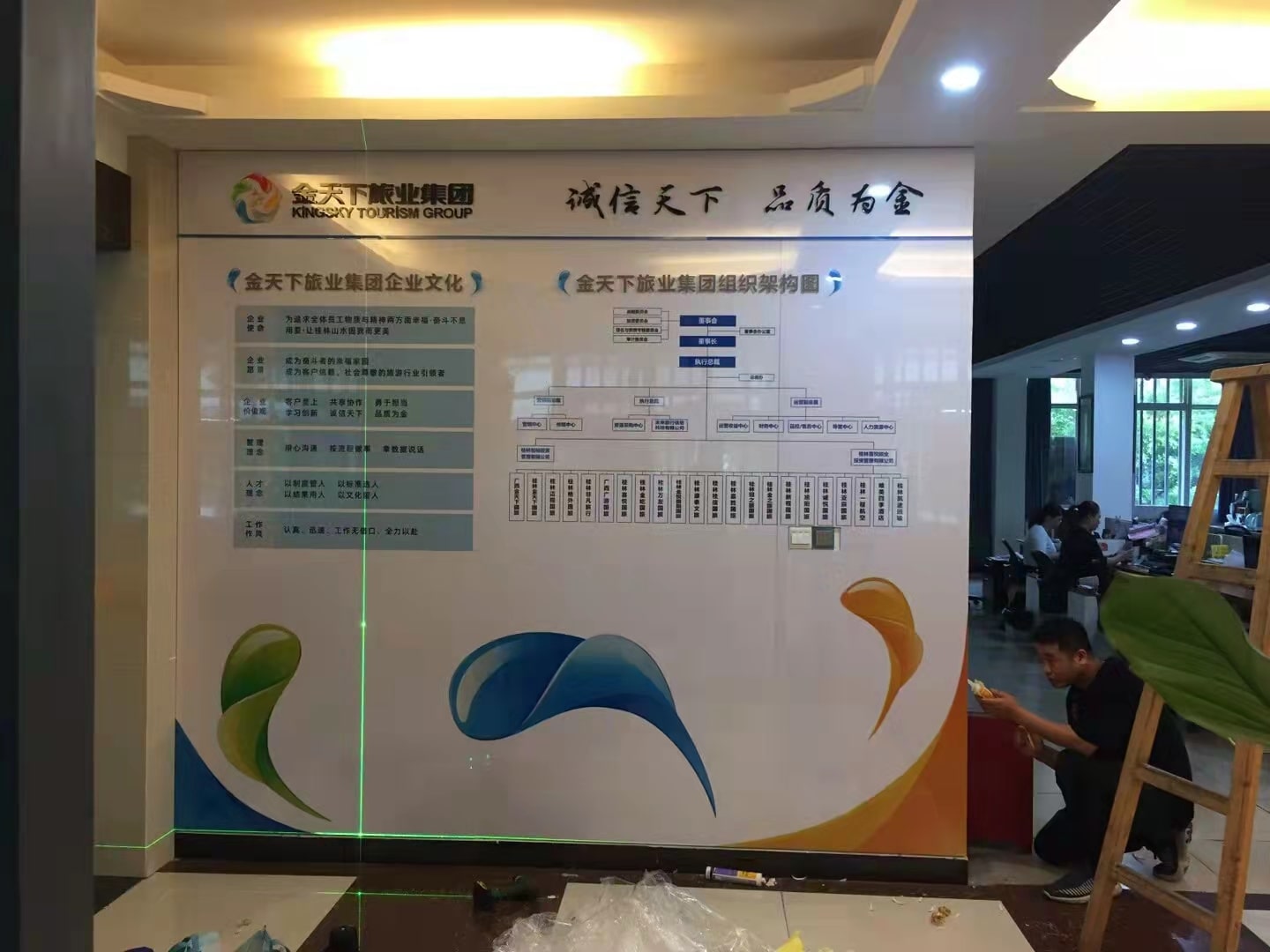 3)目前,盛和塾桂林分塾,已有幾個塾生企業(yè)長期和聚風(fēng)廣告工廠合作,比如金天下旅游集團(tuán),可以看看我們幫他們做的企業(yè)文化墻(如下圖):